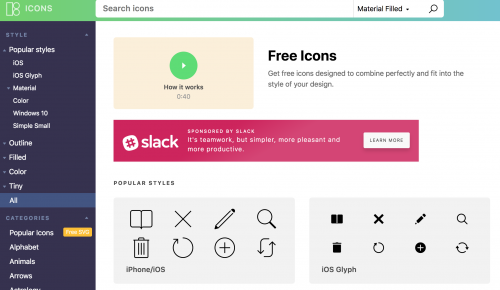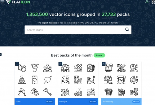 Flaticon lets you download single icons, as well as complete icon packs. Icon packs can be very useful if you need several icons for your project and want to ensure consistency (same line weight, style etc.) between icons. The service lets you download icons for free, but you’ll have to give attribution inside your project. Alternatively you can pay for a 1 month or 12 months subscription and don’t have to attribute your source.
