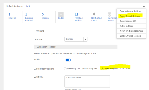 - To enable L1 feedback, navigate to the Instance defaults at the course level as admin to select the radio button ‘Make All Questions Required.’